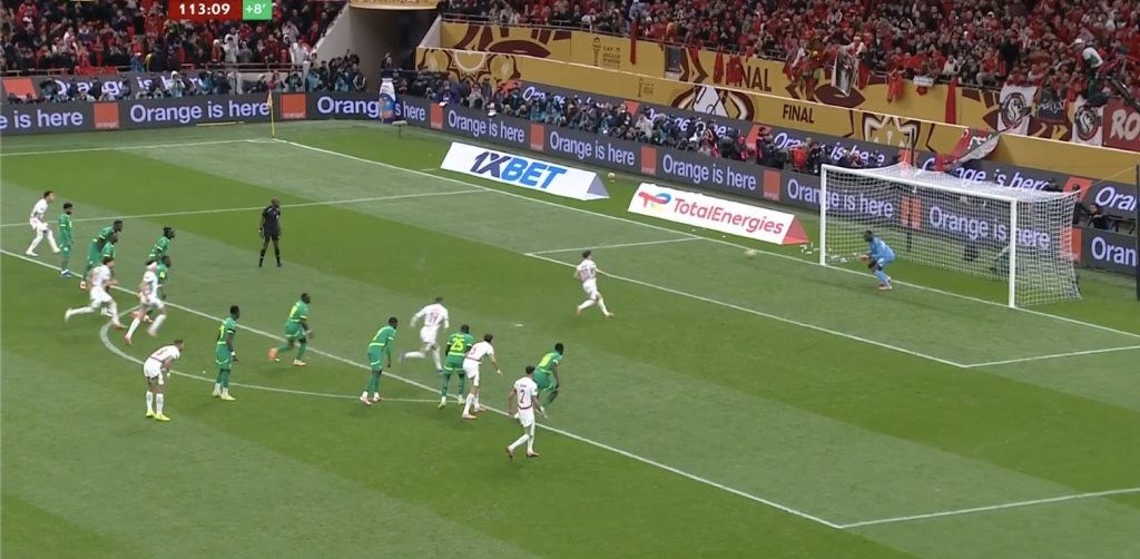 Après la reprise, Brahim Díaz s’est présenté pour tirer le penalty en toute confiance. Choisir une Panenka dans une telle situation, avec tout le poids d’un pays sur les épaules, est un acte soit de grand sang-froid soit d’excès de confiance. Díaz a opté pour un lob doux au centre du but — le célèbre geste technique qui, lorsqu’il réussit, devient instantanément une image forte et héroïque. Mais cette fois, Edouard Mendy, gardien sénégalais, a plongé droit et a capté sans difficulté le ballon. La Panenka s’est transformée en une tentative trop molle, facilement neutralisée.